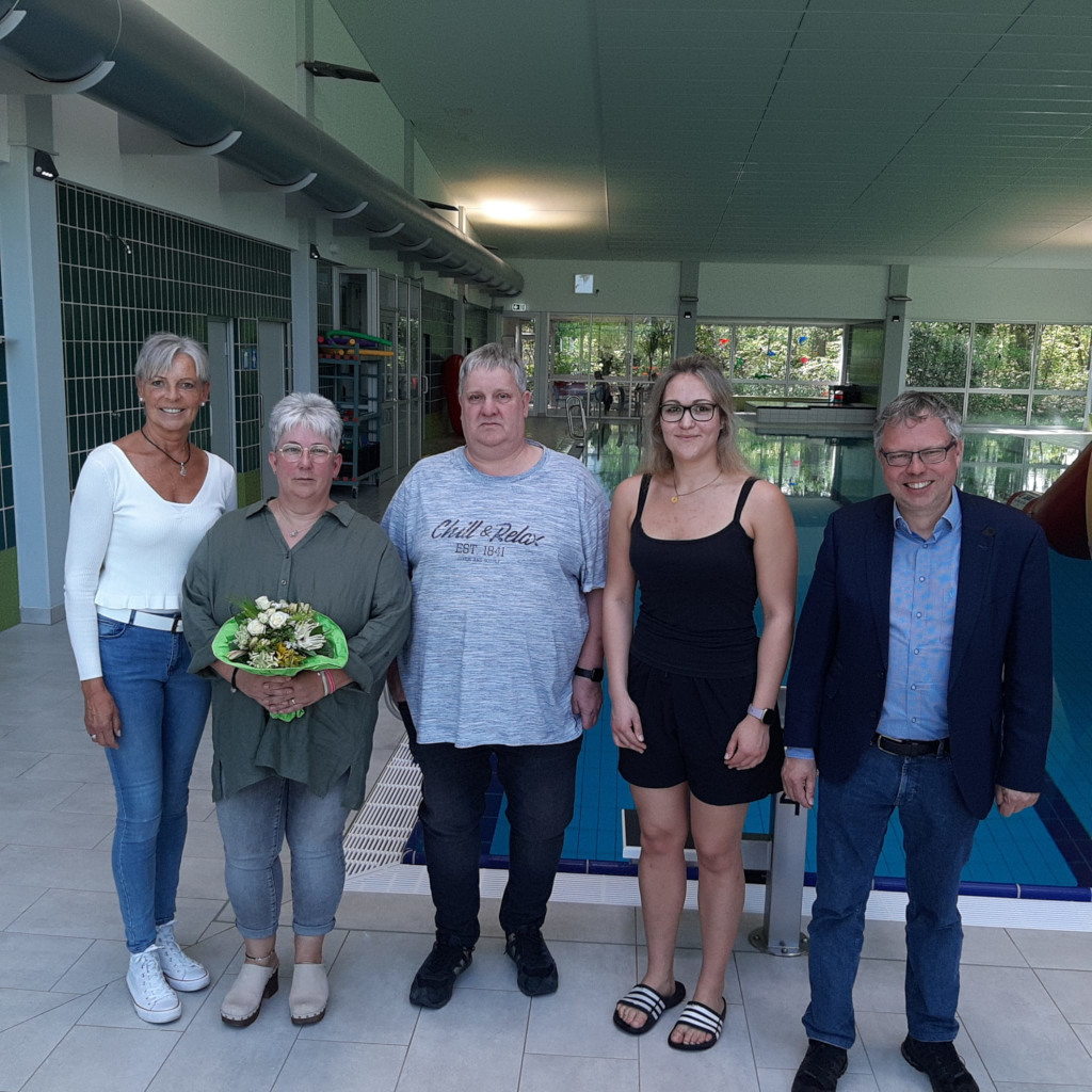 Zum Foto: Drei Millionster Badegast. Mit einem Blumenstrauß und einer Jahreskarte bedankten sich Samtgemeindebürgermeister Björn Gehrs, Schwimmmeisterin Meike Hattermann und Martina Stasko von der Verwaltung bei Ehepaar Behrens.