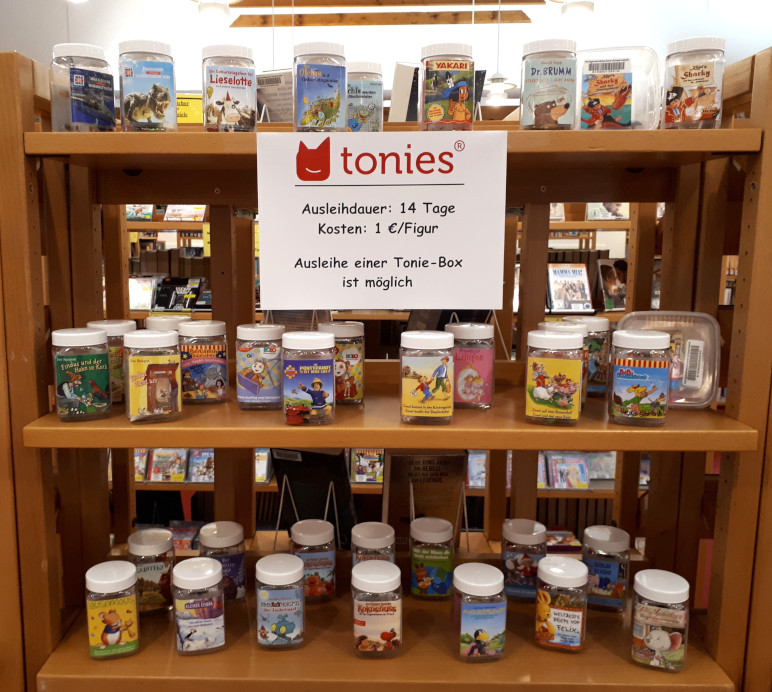 Ab sofort gibt es in der Bücherei auch die beliebten Tonies zum Ausleihen. Es wurden 40 Tonie-Figuren und 2 Tonie-Boxen angeschafft. Zur Auswahl stehen z.B. Bobo Siebenschläfer, Petterson und Findus, Benjamin Blümchen, Drache Kokosnuss, Bibi Blocksberg, die Olchis, Käpt`n Sharky und viele mehr.