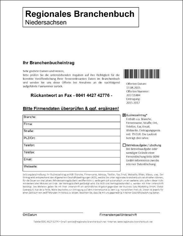 Mit dem unten abgebildeten "Branchenbucheintrag" wird aktuell wieder versucht die Unachtsamkeit von Mitarbeitern auszunutzen und einen völlig überteuerten Branchenbucheintrag zu buchen. Der Eintrag soll 79,00 Euro im Monat kosten - bei einer Laufzeit des Vertrages über 3 Jahre kostet der Eintrag somit 2.844,00 Euro! Es wird dringend davon abgeraten, solche Branchenbucheinträge abzuschließen!
