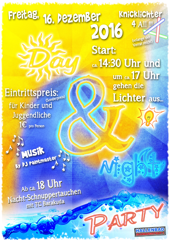 Mit einer Day u. Night Party beendet das Hallenbad am Freitag, den 16.12.2016 seine Veranstaltungsreihe für das Jahr 2016.