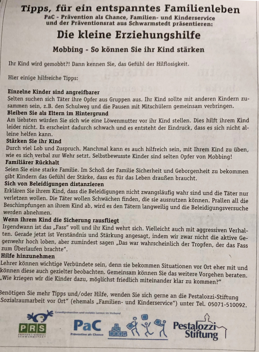 PaC - Prävention als Chance, Familien- und Kinderservice und der Präventionsrat aus Schwarmstedt präsentieren: Die kleine Erziehungshilfe. Artikel aus der Schwarmstedter Rundschau