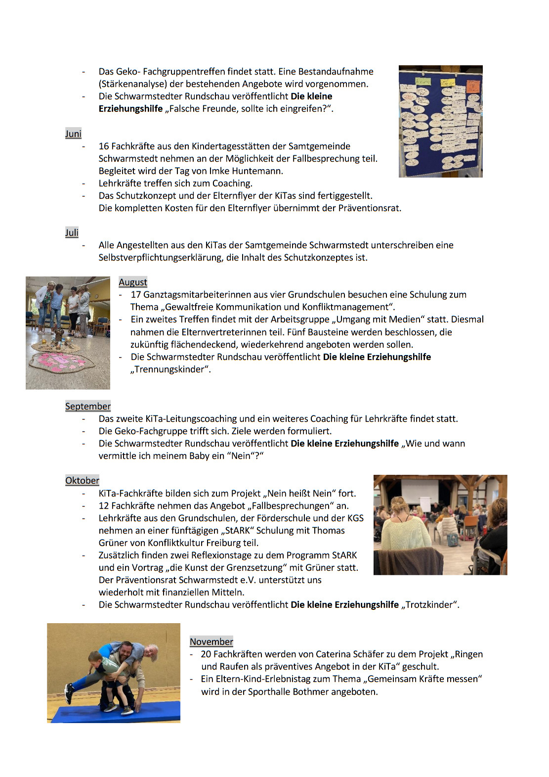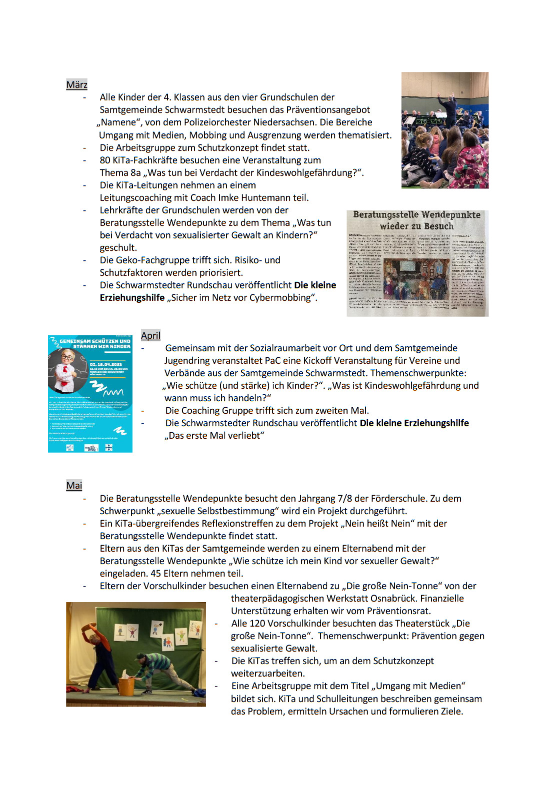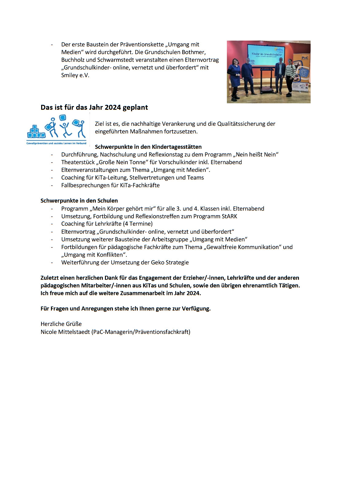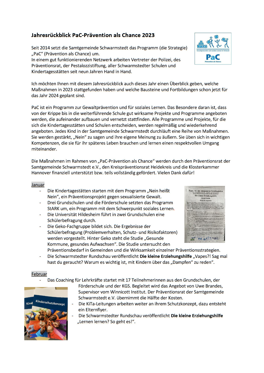 Seit 2014 setzt die Samtgemeinde Schwarmstedt das Programm (die Strategie) „PaC“ (Prävention als Chance) um. In einem gut funktionierenden Netzwerk arbeiten Vertreter der Polizei, des Präventionsrat, der Pestalozzistiftung, aller Schwarmstedter Schulen und Kindertagesstätten seit neun Jahren Hand in Hand. |