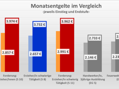 Dass ver.di in Pressemitteilungen interne Sitzungstermine der VKA kritisiert, zeigt, dass der Gewerkschaft ganz offenbar die Argumente ausgehen. „Wir sind jederzeit verhandlungsbereit. Auf interne Gremiensitzungen kommt es dabei nicht an. Es kommt darauf an, dass sich Arbeitgeber und Gewerkschaften zusammensetzen und verhandeln. Das verweigern die Gewerkschaften seit einem Monat.“ Am 21. April hatten die Gewerkschaften die Tarifverhandlungen abgebrochen und einen vorgesehenen Termin am 11./12. Mai sogar abgesagt.“ Darüber hinaus weist der VKA auf die Frage der Stellung der Erzieher/innen im Tarifgefüge des öffentlichen Dienstes hin. „Erzieherinnen und Erzieher verdienen im öffentlichen Dienst der Kommunen zwischen 2.590 und 3.750 Euro. Sie liegen damit oberhalb anderer Ausbildungsberufe des öffentlichen Dienstes, zum Beispiel Handwerker, Brandmeister bei der Feuerwehr oder staatlich geprüfte Techniker. Die Gewerkschaften fordern für die Erzieherinnen und Erzieher mit Grundtätigkeiten einen weiteren Sprung über vier Tarifgruppen. Sie lägen dann bis zu 1.240 Euro bzw. 45 Prozent oberhalb anderer Ausbildungsberufe im öffentlichen Dienst. – siehe VKA-Tabelle“, so der Arbeitgeberverband VKA.