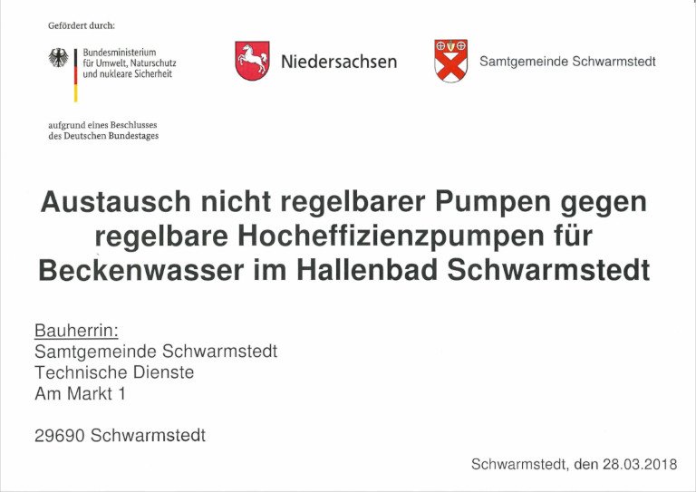 Die Samtgemeinde Schwarmstedt tauscht im Hallenbad zwei alte Beckenwasserpumpen gegen regelbare Hocheffizienzpumpen im Jahr 2018 aus.