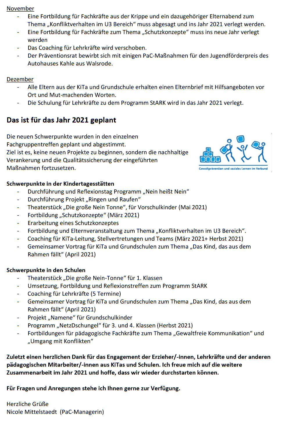Seit 2014 setzt die Samtgemeinde Schwarmstedt das Programm (die Strategie) „PaC“ (Prävention als Chance) um. In einem gut funktionierenden Netzwerk arbeiten Vertreter der Polizei, des Präventionsrat, der Pestalozzistiftung, aller Schwarmstedter Schulen und Kindertagesstätten seit sechs Jahren Hand in Hand. |