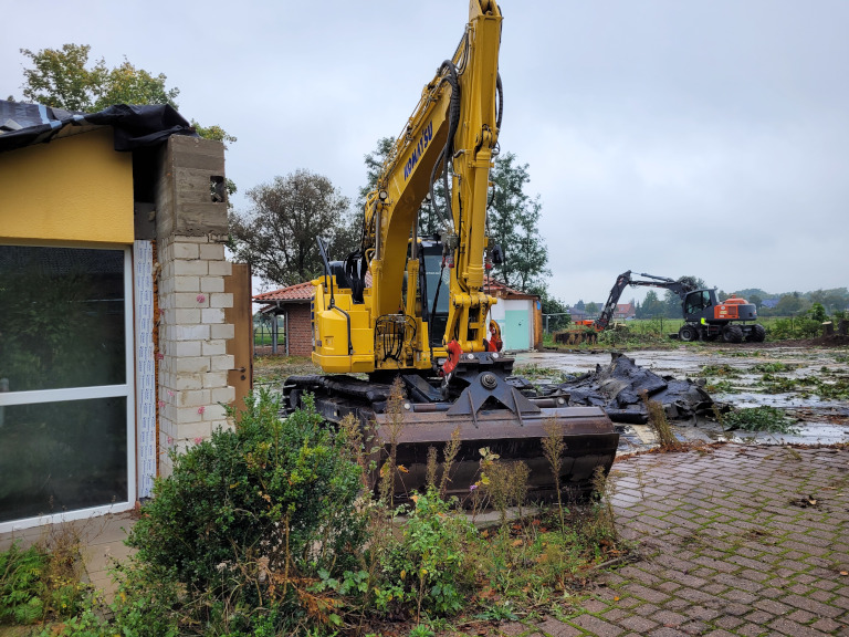 Zum Foto: Schweres Gerät an der Kita Buchholz. Der Wiederaufbau beginnt.