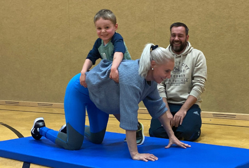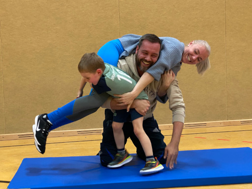 Caterina Schäfer, Wissenschaftlerin und Lehrkraft an der Universität Duisburg‐Essen, begleitet zum wiederholten Mal den Tag mit einigen Fachkräften aus den Kindertagesstätten. Gemeinsam probierten die Familien die Spiele aus, die vorher angeleitet wurden. Dabei galten die gleichen Regeln wie in den KiTas. Wir gehen respektvoll miteinander um! Erst auf drei geht es los! Kinder versuchten, ihre Eltern auf den Rücken zu drehen und das mit vollem Körpereinsatz. Sie lagen aufeinander, übereinander, waren engumschlungen. Vater und Sohn saßen sich gegenüber, sie zählten laut bis drei und versuchten sich dann so schnell wie möglich den Ball wegzunehmen. Dabei war alles erlaubt was nicht weh tat. Daneben versuchten Mutter und Tochter, sich Rücken an Rücken von der Matte zu schieben. Zuletzt war die Mäusefalle dran. Wer konnte ihr entkommen? Eltern stellten sich im Vierfüßler‐Stand (Mäusefalle). Die Kinder (Maus) versuchten hindurch zu klettern, doch plötzlich klappte die Falle zu und die Maus war gefangen. Mit aller Kraft und mit Hilfe von Papa gab es dann doch noch ein Happy End für die Maus.