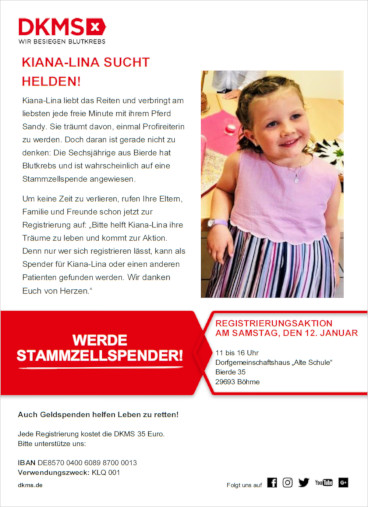 „Bitte helft Kiana-Lina ihre Träume zu leben und kommt zur Aktion. Denn nur wer sich registrieren lässt, kann als Spender für Kiana-Lina oder einen anderen Patienten gefunden werden. Wir danken Euch von Herzen.“