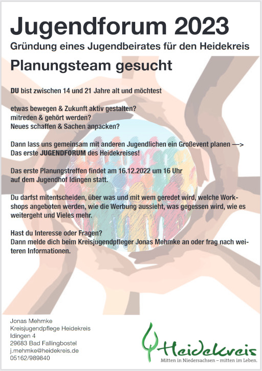 Für die Gründung eines Jugendbeirates ist der Heidekreis auf der Suche nach einem Planungsteam. Das erste Treffen findet am 16.12.2022 um 16.00 Uhr auf dem Jugendhof Idingen statt.