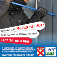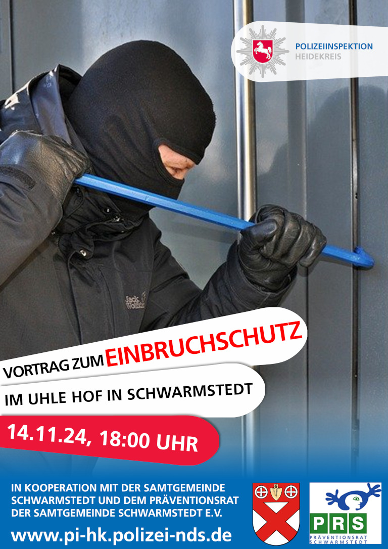 Gemeinsam mit der Polizeistation Schwarmstedt und der Samtgemeinde Schwarmstedt veranstaltet der Präventionsrat der Samtgemeinde Schwarmstedt e.V. am Donnerstag, den 14.11.2024, um 18.00 Uhr im Uhle-Hof in Schwarmstedt einen Vortrag zum Thema Einbruchschutz.