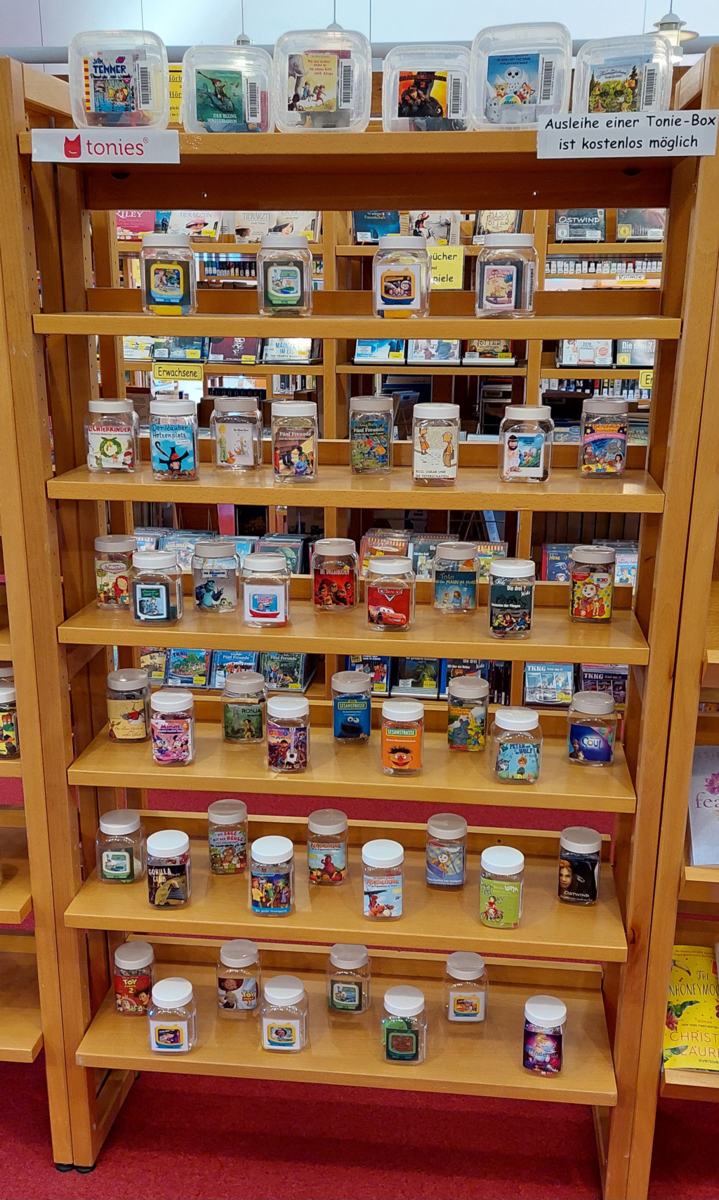 In der Bücherei gibt es 328 Tonies und 4 Tonieboxen, die mit einem Benutzerausweis kostenlos ausgeliehen werden können. Eine Mitgliedschaft ist für jede Altersklasse kostenfrei.